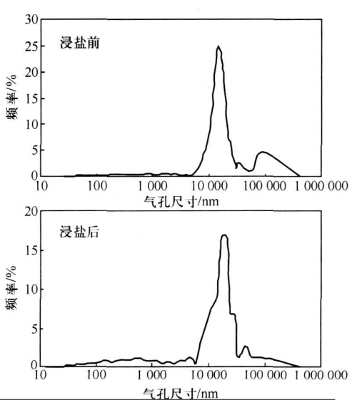 (2)經(jīng)浸鹽處理后,鎂鉻磚的氣孔孔徑減小,試樣中孔徑>10μm的孔容積百分率由浸鹽前的84.13%下降到浸鹽后的67.67%。