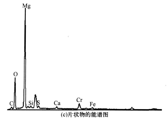浸鹽后斷口的SEM照片和能譜分析見圖4?梢钥闯,浸鹽前后試樣的斷面形貌差異較大:未浸鹽試樣的斷口表面光滑;而浸鹽后試樣的斷面上可以觀察到許多片狀附著物(見圖4(b)),經(jīng)能譜分析可知,其主元素是Mg(見圖4(c)),可知此片狀物是鎂鹽。由于這些鎂鹽主要富集在試樣的孔隙中,因此縮小了鎂鉻磚的氣孔孔徑,使材料的氣孔率降低,從而提高了浸鹽后試樣的強度,改善了試樣的抗侵蝕性。