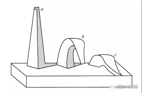 a—熔融開始以前;b—在相當(dāng)于耐火度的溫度下;c一在高于耐火度的溫度下