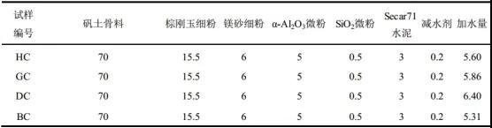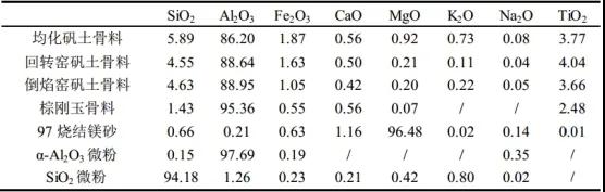 試驗以均化礬土(粒度為5~3mm、3~1mm、1~0mm)、回轉(zhuǎn)窯礬土(粒度為5~3mm、3~1mm、1~0mm)、倒焰窯礬土(粒度為5~3mm、3~1mm、1~0mm)、棕剛玉(粒度為5~3mm、3~1mm、1~0mm)為骨料。棕剛玉細粉、鎂砂細粉、Secar71水泥、活性α-Al2O3微粉以及ElkemSiO2微粉為基質(zhì),三聚磷酸鈉和六偏磷酸鈉為減水劑。試驗所用原料的化學(xué)組成列于表1。