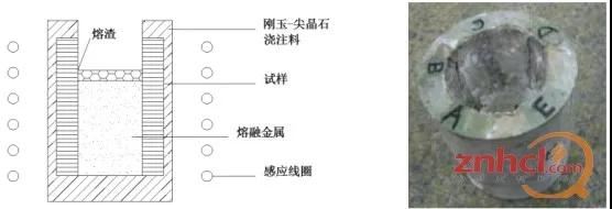 采用感應(yīng)爐法來評價試樣的抗渣性,試驗裝置示意圖見圖1。將經(jīng)過110℃干燥24h后的長條試樣澆注至坩堝里,裝入感應(yīng)熔煉爐。澆注好的坩堝如圖2所示。動態(tài)感應(yīng)爐抗渣試驗步驟為:先在坩堝內(nèi)先放入6kg左右的普通鋼,通電加熱,待鋼全部熔化后,加入308g的鋼包渣,渣的化學(xué)成分如表3所示,渣的堿度n(CaO)/n(SiO2)=4.56。待鋼塊與熔渣完全熔融時開始計時,溫度控制在1600℃,0.5h后停爐。試驗結(jié)束后,從坩堝中取出殘余試樣,除去掛渣后,沿試樣縱向軸方向從中間位置切開,分別用侵蝕面積(或侵蝕速率)和滲透面積來表征試樣的侵蝕程度和試樣的滲透程度,其中借助AdobeAcrobatPro軟件分析測量試樣的侵蝕和滲透面積。