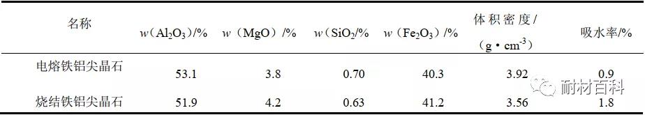 生產鎂鐵鋁尖晶石磚的一種重要原料是鐵鋁尖晶石,鐵鋁尖晶石是天然礦物,是由富含鐵的鋁土泥巖經(jīng)高溫變質而成,呈黑色晶體,硬度7.5,密度3.95~4.39g·cm-3。但自然的很少,通常以軋鋼皮和氧化鋁為原料,以燒結法和電熔法人工合成。早期電熔鐵鋁尖晶石以致密度高,顯氣孔率低,尖晶石化率高,易提高制品的體積密度,保證制品的質量,成為鐵鋁尖晶石磚生產的首選。但電熔料的成本較高,近年來隨著工藝的完善成熟,采用燒結法合成鐵鋁尖晶石推廣很快。本文通過對鐵鋁尖晶石電熔原料及燒結料合成的制品進行分析,找出兩種原材料合成制品的主要差別以及實際應用效果。1采用鐵鋁尖晶石電熔原料與燒結料生產的制品性能對比