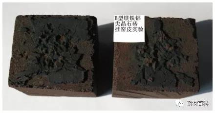 圖3B級鎂鐵鋁尖晶石磚掛窯皮實驗(左為下部磚樣,右為上部磚樣)