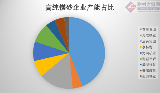 以上為目前工藝、原料都不完全相同的幾家特殊高純鎂砂產(chǎn)品有相關(guān)企業(yè)介紹,各類產(chǎn)品均有所長(zhǎng),在市場(chǎng)上都有一些穩(wěn)定的合作客戶群體。另一方面,以后英集團(tuán)、萬(wàn)成鎂業(yè)為代表的傳統(tǒng)高純鎂砂生產(chǎn)企業(yè),主要是以遼寧地區(qū)的菱鎂礦石資源料作為初始原料,首先燒制成輕燒鎂粉,然后壓球再進(jìn)入窯爐進(jìn)行煅燒。由于客戶對(duì)產(chǎn)品的認(rèn)可程度較高,仍占據(jù)一定的市場(chǎng)地位。國(guó)內(nèi)部分重點(diǎn)高純鎂砂企業(yè)產(chǎn)能分布如下: