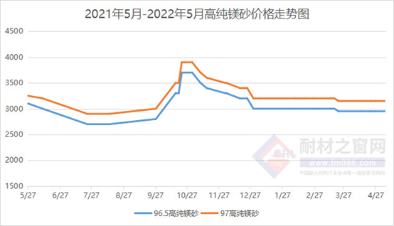 2021年下半年以來,受政策以及市場(chǎng)因素影響,高純鎂砂產(chǎn)品經(jīng)歷了過山車一樣的階段,高點(diǎn)時(shí)接近4000元/噸。2022年初受冬奧會(huì)影響,海城與大石石橋地區(qū)的高純鎂砂生產(chǎn)企業(yè)又多處于停產(chǎn)狀態(tài),產(chǎn)能釋放不足,3月中下旬開始,全國(guó)各地區(qū)蔓延的疫情,也使得企業(yè)處于生產(chǎn)和銷售兩難的境地,企業(yè)也承擔(dān)了較高的成本壓力。近一年價(jià)格走勢(shì)見下圖: