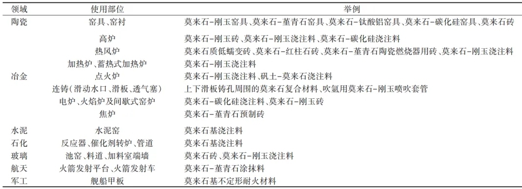 除上述應(yīng)用領(lǐng)域外,以莫來(lái)石為原料制備的高性能耐火材料還被應(yīng)用于玻璃、水泥、石化、電力等領(lǐng)域的高溫設(shè)備中。電熔莫來(lái)石可用于制備玻璃窯體爐襯磚、無(wú)堿玻璃沉淀池莫來(lái)石磚;以莫來(lái)石為原料制備的石錫槽磚是浮法玻璃窯成型階段筑爐用的一種關(guān)鍵耐火材料;采用莫來(lái)石制備的莫來(lái)石-剛玉澆注料也被應(yīng)用于玻璃窯。以低鋁莫來(lái)石(M45)為主要原料制備的低鋁耐堿莫來(lái)石磚,具有良好的抗堿侵蝕性、抗熱震性、耐高溫性,較高的荷重軟化溫度,較低的體積密度和熱導(dǎo)率,不僅適用于水泥回轉(zhuǎn)窯預(yù)熱帶、安全帶、三次風(fēng)管、燒成帶、冷卻帶等中、低、高溫區(qū)域,也可應(yīng)用于活性石灰煅燒、鉻鹽焙燒、堿-石灰燒結(jié)法生產(chǎn)氧化鋁等回轉(zhuǎn)窯,能夠?qū)崿F(xiàn)窯爐輕型化,減少筒體熱損失,具有節(jié)能降耗的作用;以莫來(lái)石為主要原料制備的莫來(lái)石基澆注料則被應(yīng)用于水泥回轉(zhuǎn)爐窯口、水泥窯蓋、三風(fēng)管機(jī)頭冷機(jī)等部位。莫來(lái)石基耐火澆注料還可應(yīng)用于石化液態(tài)催化轉(zhuǎn)爐等石化工業(yè)。綜上,歸納莫來(lái)石及其復(fù)合耐火材料的主要應(yīng)用,見表1。
